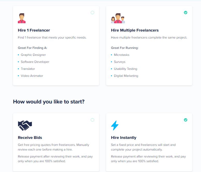 When you are creating a project, the options available to you change depending on what you select. For an example, we will be showing how you can determine a budget for hiring multiple freelancers instantly.