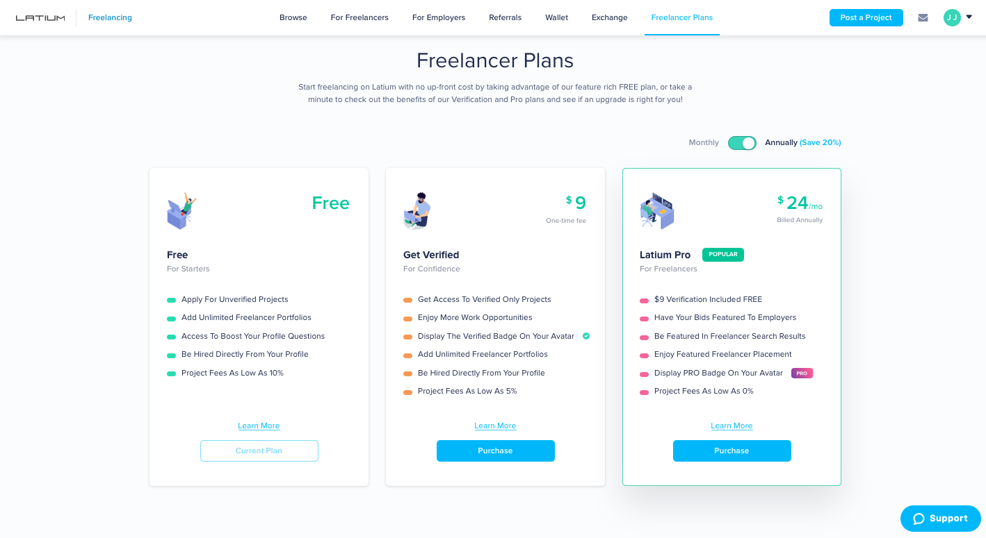 The Latium Pro option provides users with the best opportunity to be awarded projects. With payments as low as $24/month, Freelancers will enjoy an included verification, all bids showing at the top of lists for employers, the lowest project fees in the industry and the ability to be a Featured Latium Freelancer.